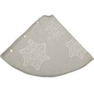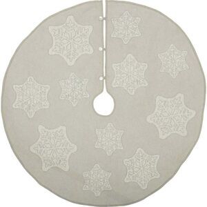 Detailed Features — This truly festive Snowflake Tree Skirt features ash grey woven cotton fabric with appliqued snowflakes in antique white tobacco cloth, detailed with silver Lurex metallic yarn for a touch of holiday magic. Shimmery silver thread creates a detailed, elegant look on each snowflake. Reverses to textured heather grey cotton fabric, finished with 3 pearl button closures and loops to secure skirt around tree.