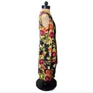NEW Floral Sleeveless Dress by En Focus. Green, red, yellow floral pattern on black, mesh front for added detail, large pleats at waist. Perfect for a shower, special event, wedding, church.