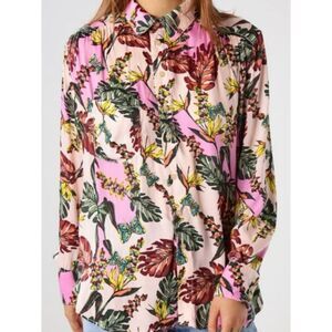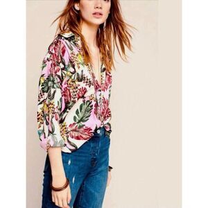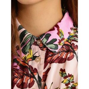 Everyday is a vacay with the Free People Under the Palms Button-Up Top! Silky woven poly features a bold pink, peach, burgundy, and green print as it shapes this classic button-up top with a collared neckline and long sleeves with button cuffs. Relaxed bodice with patch pocket and a rounded high-low hem. Measures 21” flat pit to pit, and 22” from bottom of neckline to hem at center front. All measurements are approximate. New, without tags - never worn.