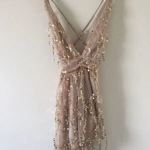 This dress features a plunging neckline and an open, crisscross back. Empire waist and optional self tie sash. Stretchy, satin-like fabric with beige chiffon lace overlay adorned with hand sewn gold sequins. Built-in shorts and adjustable straps. Brand new boutique item!