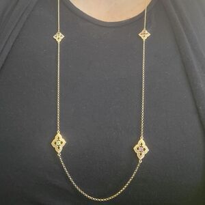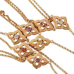 Brand from the factory new PAJ gold over sterling genuine gemstone station necklace. The gemstones are garnet, amethyst, blue topaz, peridot. Nice piece for layering or to wear stand-alone.