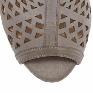 NEW Gray Laser-Cut, Open-Toe Heels with Woodgrain Heel and Ankle Buckle Closure