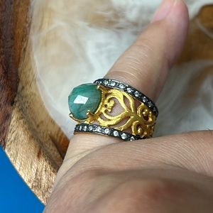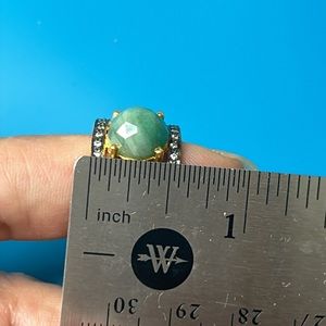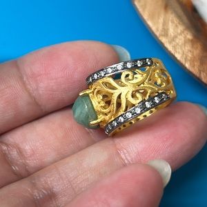 NEW💕Gift but never wore. Unique and rare design! It has beautiful faceted unsure green stone, not sure if it’s jade or aventurine or other stone. Wide filigree goldtone band with unsure clear stones around. The bottom of band doesn’t have. No missing pieces. Size approx 5.5-5.75 and weights 5 grams. Unmarked. Not gold (tested). But very pretty!