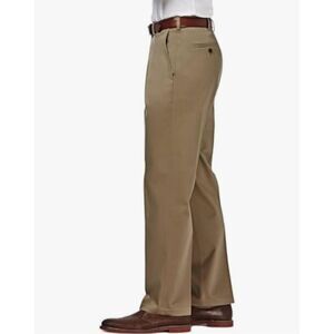 PREMIUM NO IRON KHAKI: Eliminate the need to iron with the premium khaki pant from Haggar. Featuring a hidden expandable waistband that stretches up to 3", off seam front pockets, single welt back pockets in a flat front, classic fit silhouette.