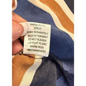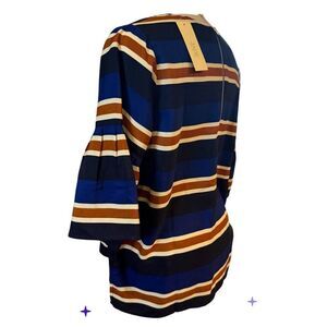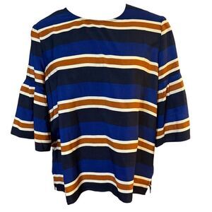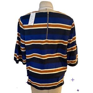 Sporty blue and brown stripe top by Jade. Size XL. Round neck and elbow length sleeves. Back zip. New with tags.