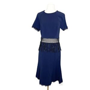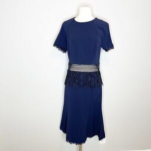 NEW Jonathan Simkhai Size 10 Navy Blue Cut Out Midi Dress Lace Fringe Straight