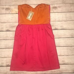 New with tags! Judith March Pink Ikat Dress. Strapless. Sweetheart neckline. Orange top with embroidered pink Ikat design. Hot pink skirt. Dress has boning for added support and structure. Pockets! Hidden back zip with hook and eye closure. This dress is beautiful and so fun! The skirt is double lined. Exterior: 96% cotton, 4% Lycra. Interior: 100% polyester.