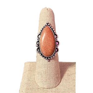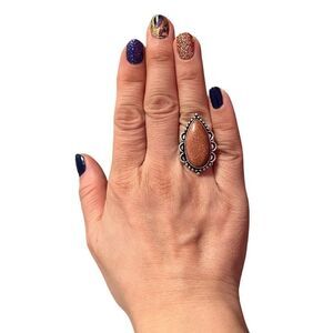 Silver plated. Large teardrop shaped genuine gold sandstone with a scalloped setting. Makes a great cocktail ring.