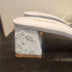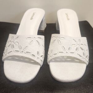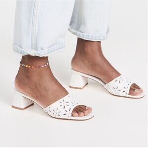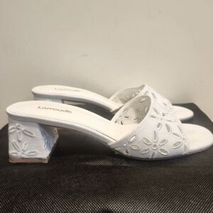 Larroude "Brigitte" White Canvas Slides w/Embroidered Floral Cutouts
