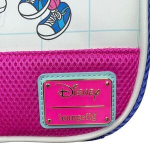 Get fit, 80's style! The Loungefly Disney Mousercise Mini Backpack pays homage to the old exercise program that featured Disney songs and fun workouts for all ages. You'll find Mickey, Donald and Minnie printed on the front and back burning off a few calories with the Mousercise logo at the top. The bag features a pluto enamel zipper pull, a sports jersey trim along with other debossed and embroidered details.