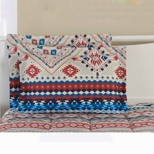 Brand New with tags. Adobe red, fresh blue, & desert-toned neutrals form traditional patterns on the comforter. Matching shams. A printed decorative novelty pillow proclaims “Not my Prob-llama” for a playful touch. White sheets with a blue southwestern diamond pattern complete the look. The comforter flips to a deep blue for an alternate look.