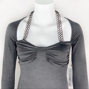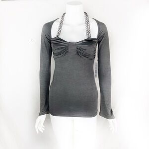 Brand new with tags. Never worn. MKC - Marisa Kenson Collection. Marisa K Top is for all Dressy occasions. Beautiful shimmering charcoal gray color. Sexy neckline with attached link necklace with rhinestones thrown in. Ruching at the bust line. Super stretchy. Hidden bralette inside. Ohhh so sexy!!