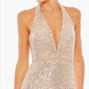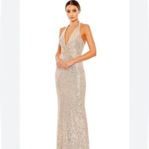 NEW Mac Duggal 11277 Women's Ieena Sequined Halter Strap Plunge Neck Gown