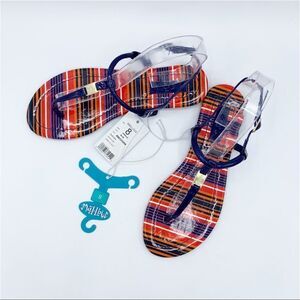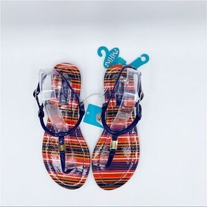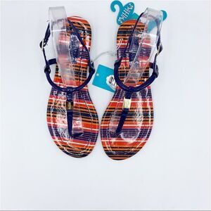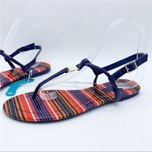 Pack these jelly flip-flops in your bag and you will be ready for the pool, beach, vacation or just hanging. Blue patent leather straps with gold logo. Footbed is blue/orange/red/white stripes. The navy blue gives these a nautical vibe. Flat and comfortable. Side buckle. Please see photos for additional details.