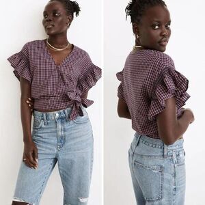 NEW Madewell Flutter-Sleeve Side-Tie Wrap Top in Plaid, S