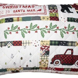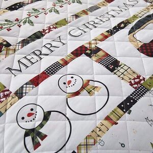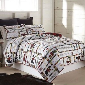 MERRY CHRISTMAS FARMHOUSE KING QUILT SET!! This lively, 3-piece quilted microfiber bedding collection features a variety of Christmas-related motifs, surrounded by patchwork borders. Colors include white, black, pine and olive green, dark red, gold and chestnut brown. The coordinating shams complete the ensemble. Each set comes with a free, reusable tote bag. KING Quilt is 104x96 inches and includes two king size pillow shams. Quilt is reversible to a red/black buffalo plaid!
