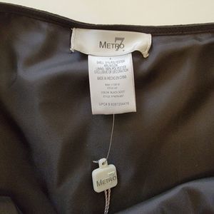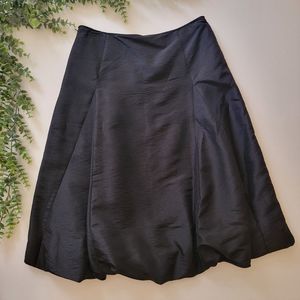 Chic, silky smooth little black skirt by Metro7 featuring gold floral embroidery and a back rear zipper.