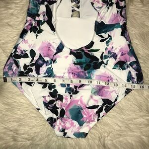 New without tags! ModCloth Pamela One-Piece Swimsuit. White multi color floral design. Flaunting halter ties, removable padded bust cups, crisscross accents at the plunging neckline, and a high-waisted cut.