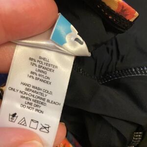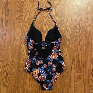 Black floral halter one piece swimsuit. Removable padded bust, crisscross accents at the plunging neckline, a high-waisted cut and a gorgeous floral print. Fully lined. Slide & clasp closure. Removable bust cups. Floral print is teal green, blue, orange, peach and burgundy. MSRP $79