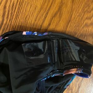 Black floral halter one piece swimsuit. Removable padded bust, crisscross accents at the plunging neckline, a high-waisted cut and a gorgeous floral print. Fully lined. Slide & clasp closure. Removable bust cups. Floral print is teal green, blue, orange, peach and burgundy. MSRP $79