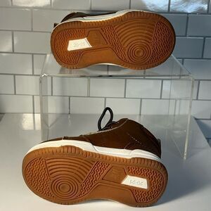 High tops with lightly padded edge and tongue. Laces at front, zip at side, and loop at back. shearling lining and insoles.