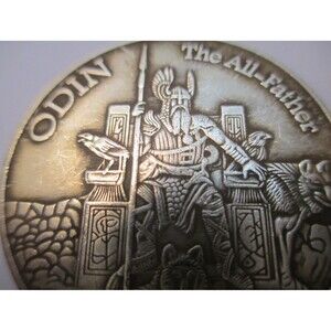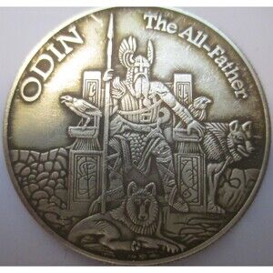 REVERSE, ODIN: In Norse mythology, Odin is the father of all gods, and his image is captured brilliantly in this round where he sits upon his throne flanked by many of his common animal companions from Norse mythology. These creatures include his wolves Geri and Freki. Engravings identify Odin and his status as “The All-Father.”