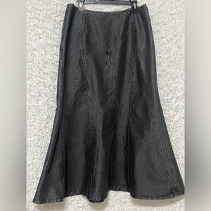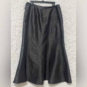 DARK GRAY JEANOLOGY, PANELED DESIGN BOHO GRUNGE, MERMAID HEM MAXI SKIRT, BACK ZIPPER, FLARED SKIRT BOTTOM, PRE OWNED IN EXCELLENT CONDITION.