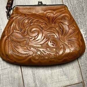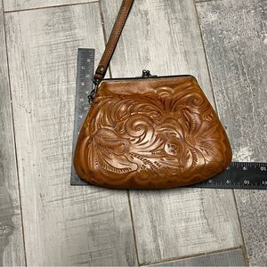 Beautifully tooled luxury leather purse /clutch. Finely detailed with: Antiqued metal details and burnt edges. inside: 3 credit card pockets, 1 zippered pocket and one open pocket as well as center area. Measures: 9" W x 7" H x 2" D