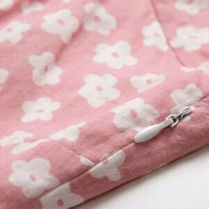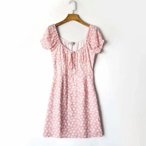 This dress is super comfy and is made from 100% cotton! It has a pink daisy print, a ruched bust, and ruffle trim puff sleeves. A drawstring at bust lets you ruche and customize the fit. Can also be worn off the shoulders. Hidden zipper closure on side. Inline elastic around sleeves.
