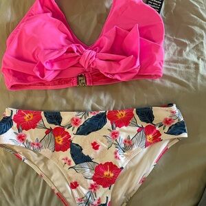 Vibrant pink bikini top with a bow. Floral patterned bikini bottoms with pink and blue accents.