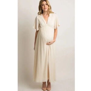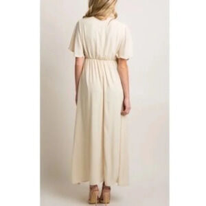 A Gorgeous solid hued, chiffon maxi dress featuring cinching under the bust, short bell sleeves, a v-neckline, and double lining to prevent sheerness.