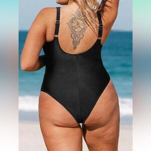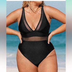 Design: Show off in Solid Black V Neck Sheer Plus Size One Piece Swimsuit. The Mesh Panels at the Neckline and Waistline Added Extra Playfulness That Every Girl Likes