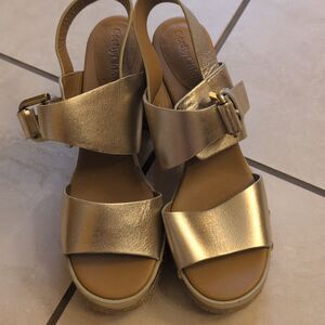 NEW, never worn, but FLAWED See By Chloe Lamb Joline Heel Sandals Block Platform in metallic Gold with large buckles. Genuine soft lamb leather with metallic gold paint finish. Has dents in leather in a couple place shown in closeup pictures. Made in Spain. European size 39.5, US size 9 equivalent. Please see measurement picture of heel. Retailed for $450, and heavily discounted for flaws. Offers welcome!