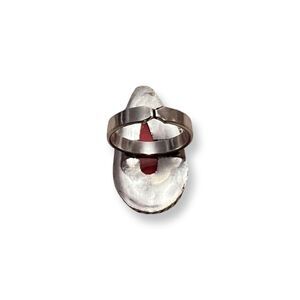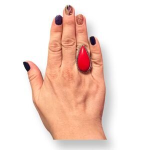 Brand new. Silver plated. Not marked. Genuine coral. Teardrop shape. Size 6.75 right now but the silver is malleable so it can be adjusted a little. Coral is 1.25” long.