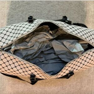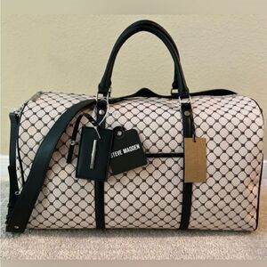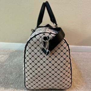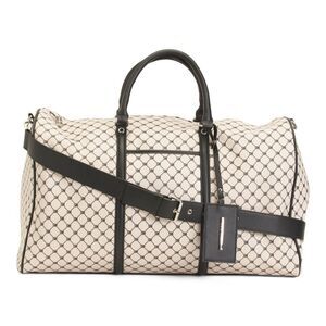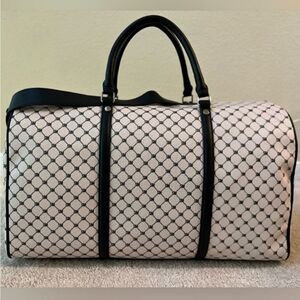 Cream/black faux leather, dual carry handles, detachable shoulder strap, detachable luggage tag, metal feet, 1 interior zip pocket, 2 interior slip pockets