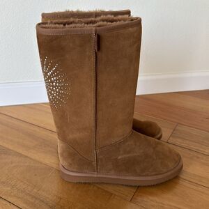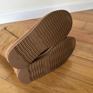 Faux suede, 13” tall. No size tag but the soles are 11” so my guess is 9/9.5.