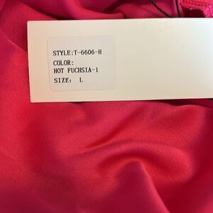 Vibrant pink bodysuit with feather cuffs. Stylish and bold design.