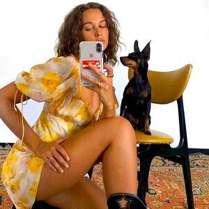 This empire waist mini dress has an all over sunny floral print. It has a ruched sweetheart bust, dainty ruffle trim, and pretty puff sleeves with ties. The open back has a cinched band closure and adjustable ties at the bottom for ruching. Fully lined with built-in white slip underneath.