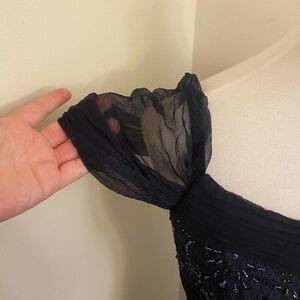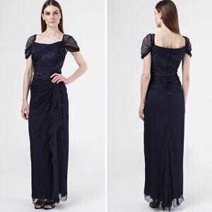 Navy blue silk long maxi length gown. Lace and beading details. Fully Lined. Gathering and pleating. Padded bodice. Formal. Cocktail. Great for a wedding, ball, gala or other formal event.