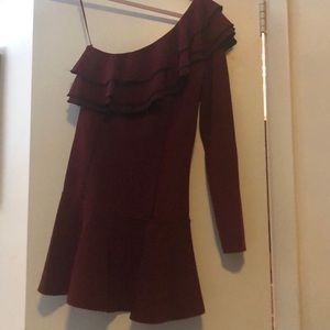 The Room burgundy ruffle mini dress. One sleeve. Fluted bottom. It’s a thicker fabric. Great for cooler weather!