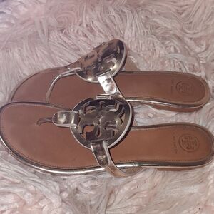 Elegant Tory Burch sandals with metallic bronze/gold accents. Tan footbed for a classic look. Perfect for any occasion! size 8.5