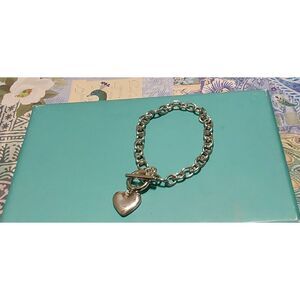 Need a last minute gift idea or stocking stuffer?. This pretty necklace and bracelet set will do the trick. Done in a heavy sterling silver plate and rhodium finish that will keep it from tarnishing, both the necklace and bracelet has a cute puffed heart charm and close with a Toggle style closure. The necklace is 18 in in length and the bracelet is 7.5 in in length.
