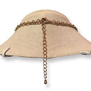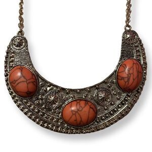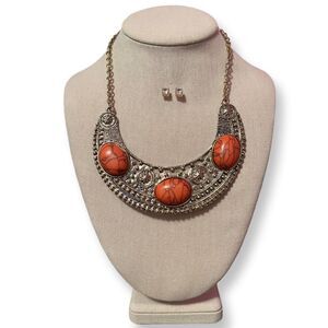 Definitely a statement necklace. Tribal style gold tone and cracked orange necklace is stunning. The chain measures 16.5”. This doesn’t include the metal center. There’s a 3.25” extender. This set also comes with faux diamond stud earrings. Gorgeous set.