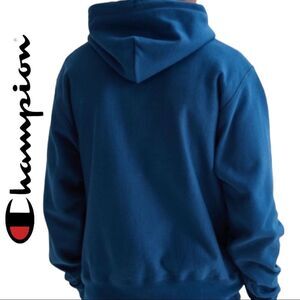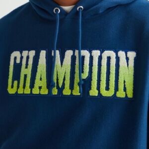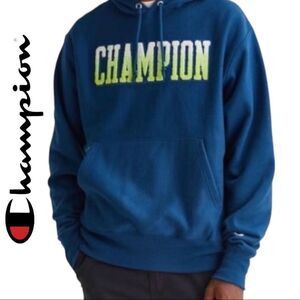 New with Tags from Urban Outfitters UO. Champion pullover blue sweatshirt with gradient collegiate style logo text at the front. Fitted with an adjustable hood, kanga pocket and ribbing trims.