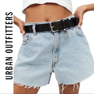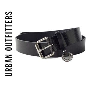 Classic leather belt with a cracked treatment for added texture. Square metal buckle and ring accent.