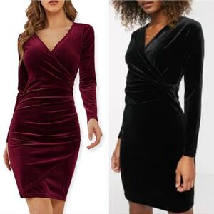 NEW! Velvet Long Sleeve V Neck Ruched Date Night Cocktail Dress