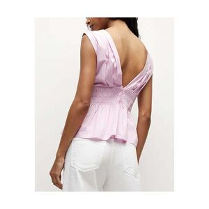 Veronica Beard Barely Orchid Evra TopDeep v neckDeep v backSleevelessSmocked through waistConcealed back zip closurePeplum silhouetteLined84% cotton, 12% polyamide, 4% spandex outer, 100% cotton liningchest- 18.5" acrossLength- 23"