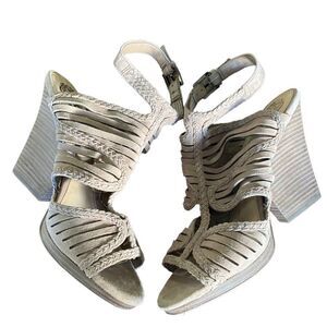 New without box. Small pink stain on the back of each sandal and a tiny black dot on the toe area of one of the sandals (not noticeable when wearing), see photos for condition.