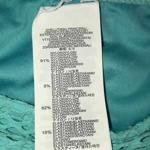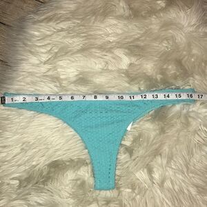 New with tags. Volcom Love and Haight Tiny Bikini Bottom. Blue bird, turquoise shade. Crochet textured detail. Low-rise bottoms with a Brazilian cut and cheeky fit. Volcom rubber emblem at back. Fully lined. Minimal coverage.
