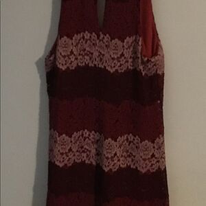 This dress is gorgeous! By Wet Seal, it is brand new and never worn without tags. It is done in alternating wine and apricot colored lace panels. It has an open V style front with a choker style neckline. The flare style mini has a keyhole back and a double gold button closure. It is fully lined and is size Large. It is 35” in length from the top of the shoulder to the bottom hem. It is 16-17” across from armpit to armpit, but is very roomy.